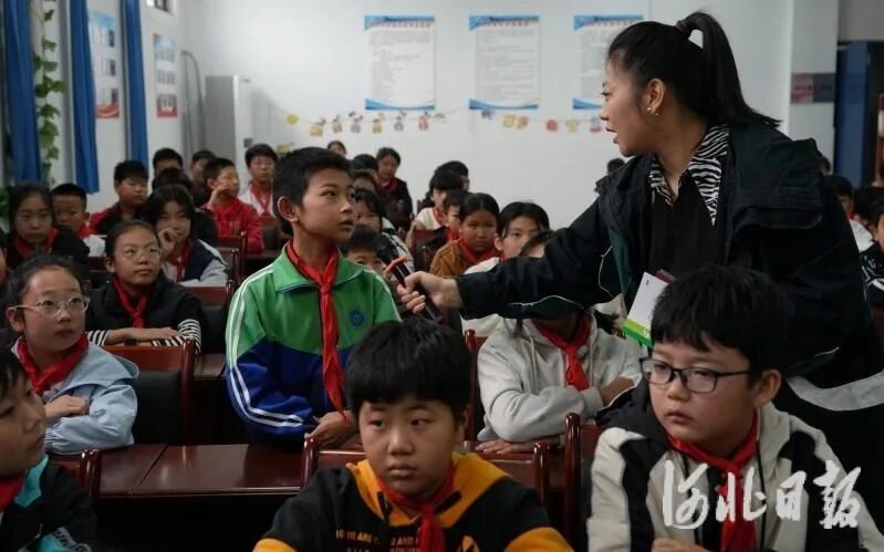 图为迁安市图书馆工作人员正在与学生互动问答。张泽慧摄