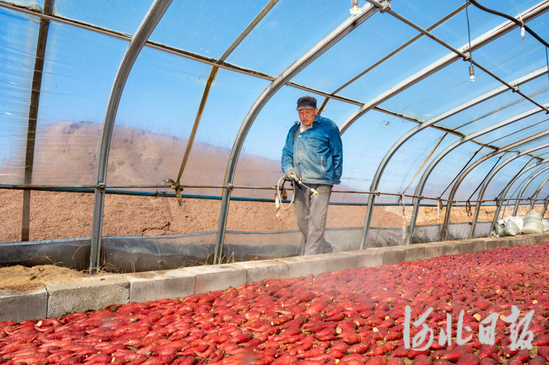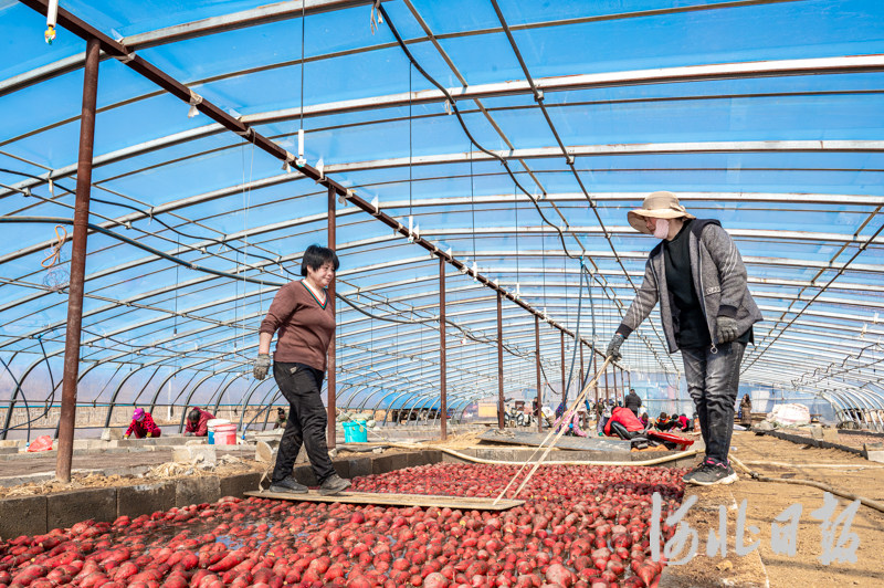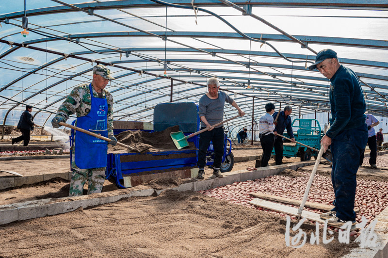 图为迁安市建昌营镇新立村福禄红薯秧苗专业合作社的农户将育苗床上的红薯种压实。