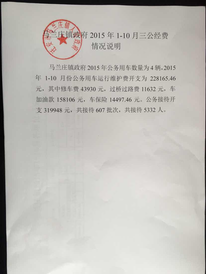 马兰庄镇政府2015年1-10月三公经费情况说明