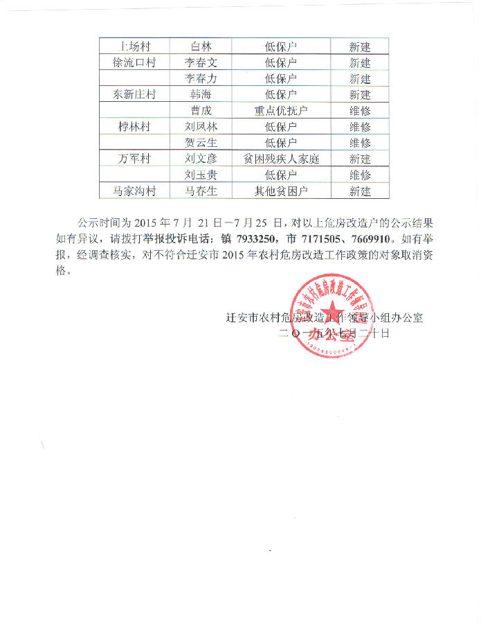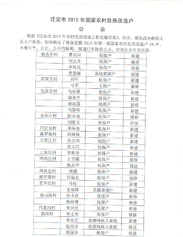 杨各庄镇2015年农村危房改造公示