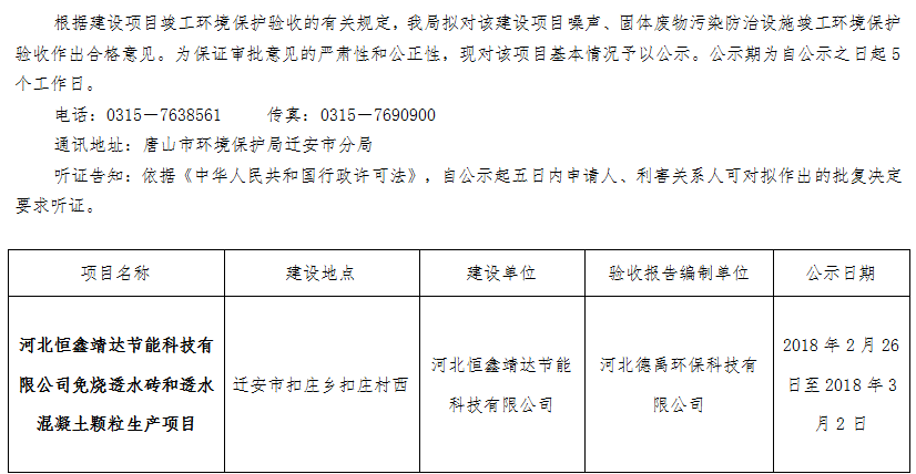 河北恒鑫靖达节能科技有限公司免烧透水砖和透水混凝土颗粒生产项目 噪声、固体废物污染防治设施竣工环境保护验收拟批准公示