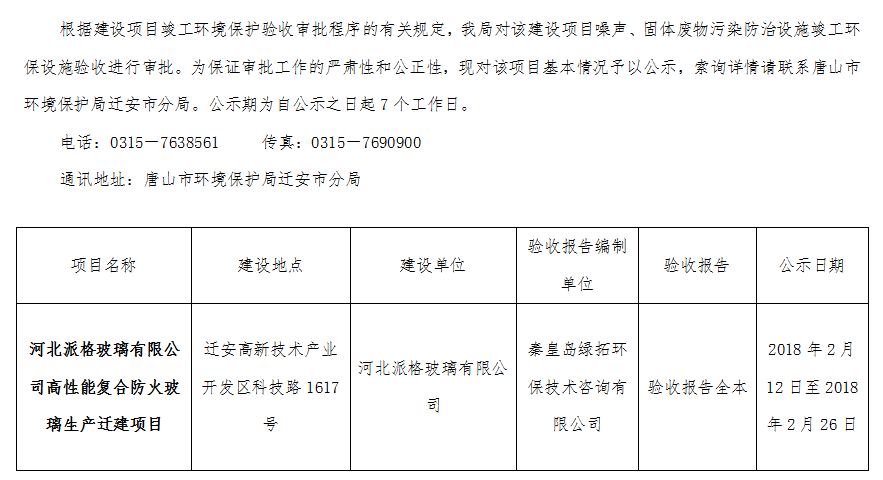 河北派格玻璃有限公司高性能复合防火玻璃生产迁建项目噪声、固体废物污染防治设施竣工环境保护验收受理情况公开