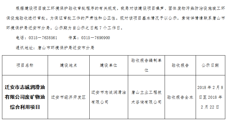 迁安市志诚润滑油有限公司废矿物油综合利用项目噪声、固体废物 污染防治设施竣工环境保护验收受理情况公开