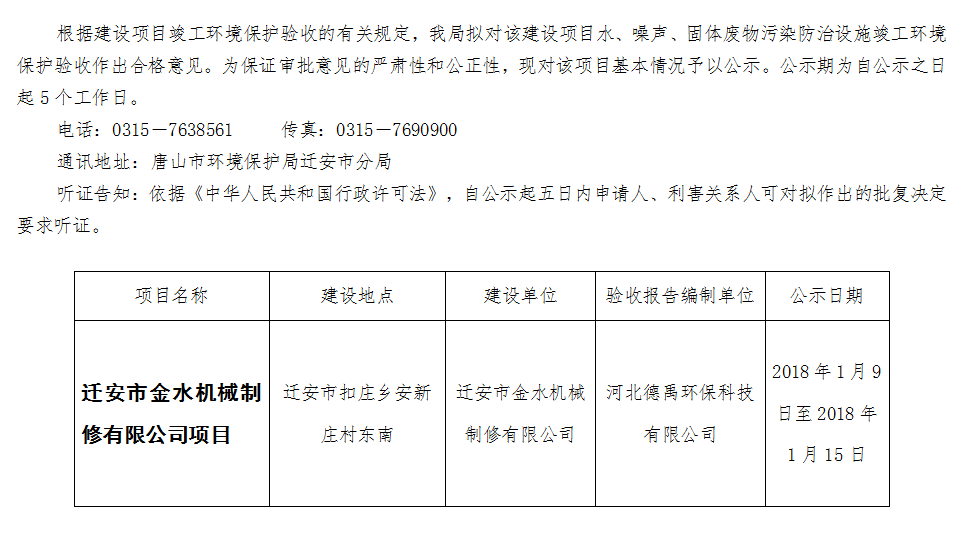 迁安市金水机械制修有限公司项目水、噪声、固体废物 污染防治设施竣工环境保护验收拟批准公示