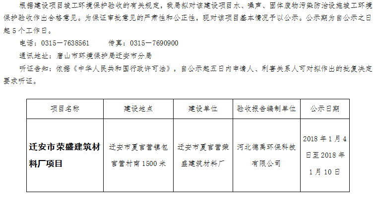 迁安市荣盛建筑材料厂项目水、噪声、固体废物 污染防治设施竣工环境保护验收拟批准公示
