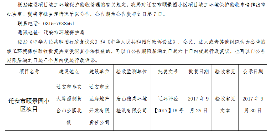 迁安市颐景园小区项目竣工环境保护验收审批决定公告