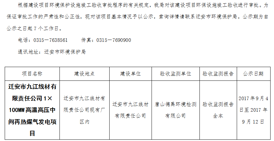 迁安市九江线材有限责任公司1×100MW高温高压中间再热煤气发电项目环境保护设施竣工验收受理情况公开