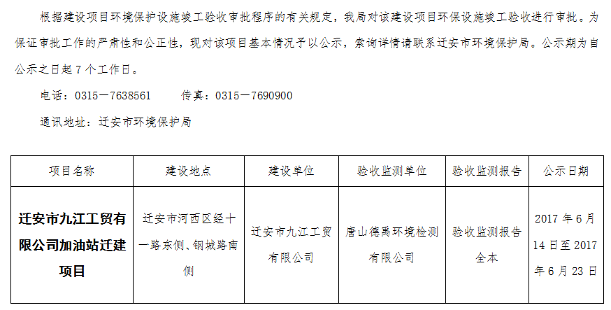 迁安市九江工贸有限公司加油站迁建项目环境保护设施竣工验收受理情况公开