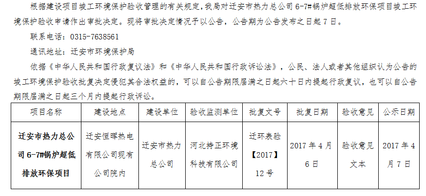 迁安市热力总公司6-7#锅炉超低排放环保项目竣工环境保护验收审批决定公告