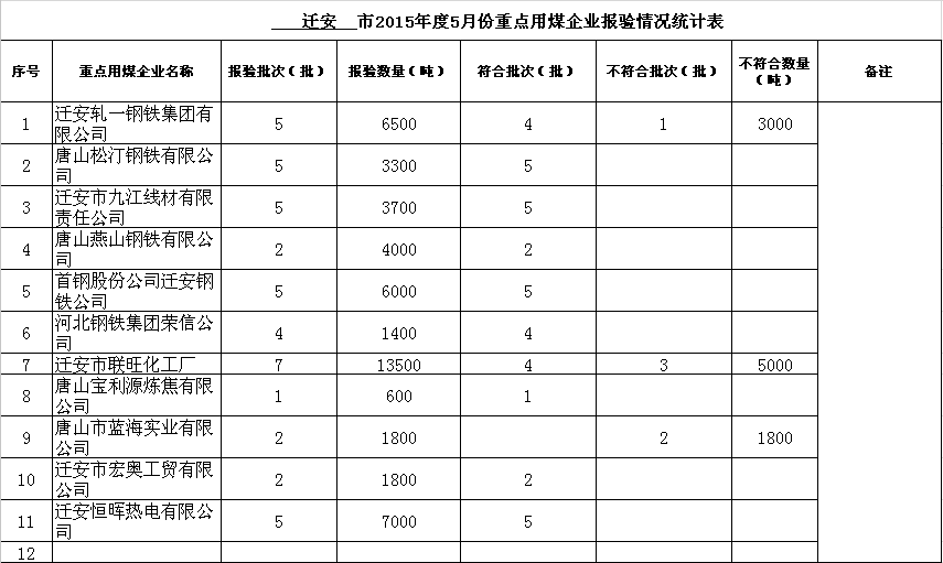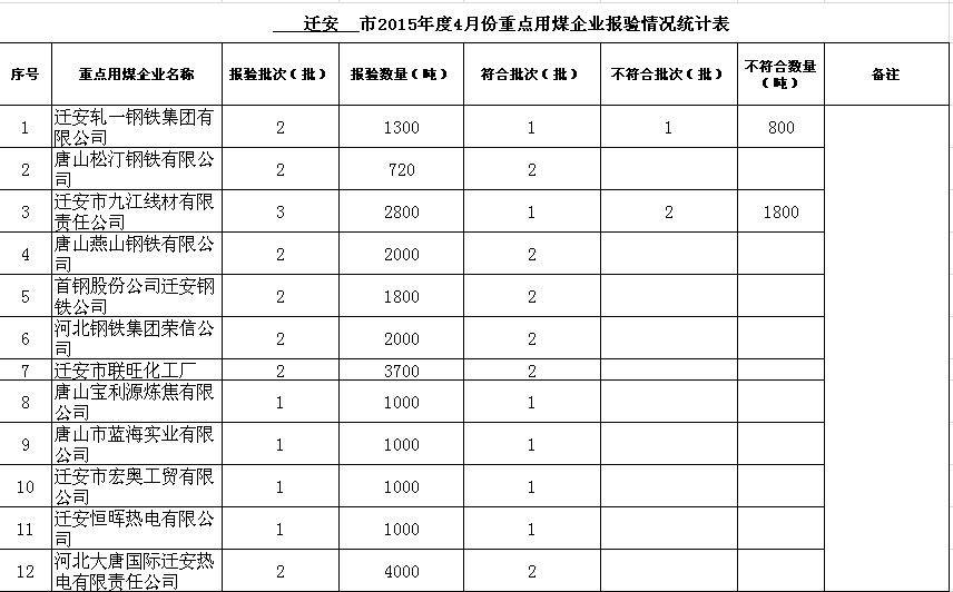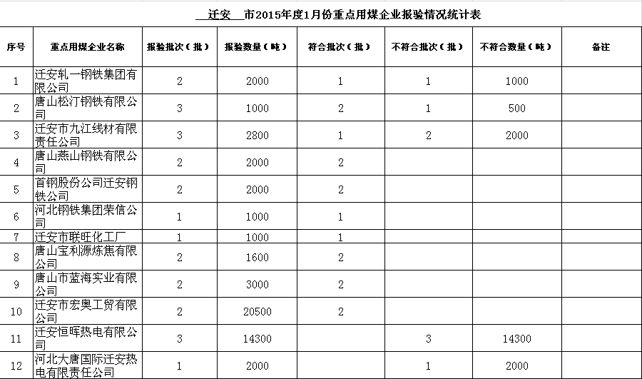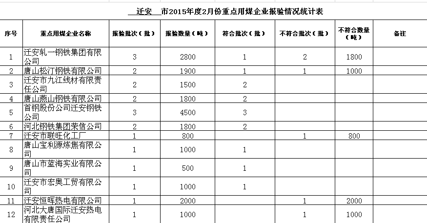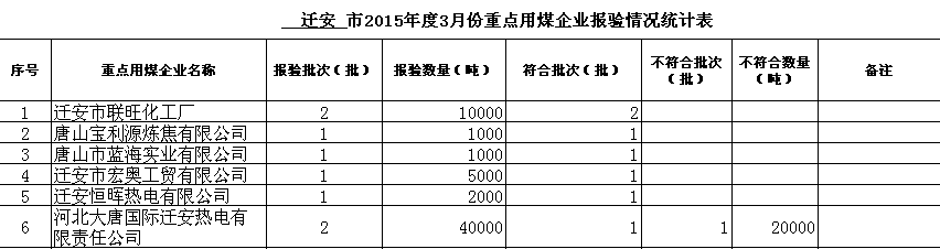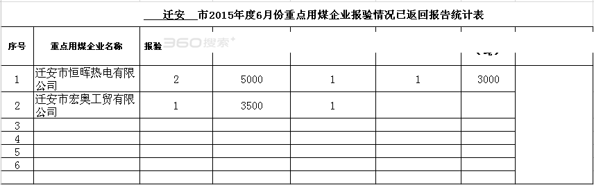 2015年度1-6月份重点用煤企业报验情况统计表