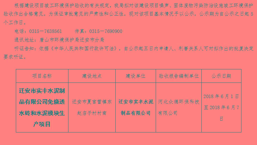 迁安市实丰水泥制品有限公司免烧透水砖和水泥模块生产项目噪声、固体废物污染防治设施 竣工环境保护验收拟批准公示