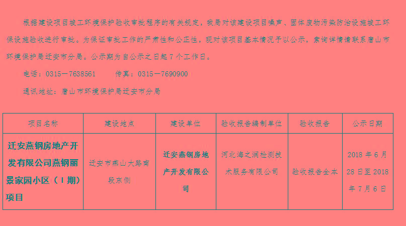 迁安燕钢房地产开发有限公司燕钢丽景家园小区(Ⅰ期)项目噪声、固体废物污染防治设施 竣工环境保护验收受理情况公开