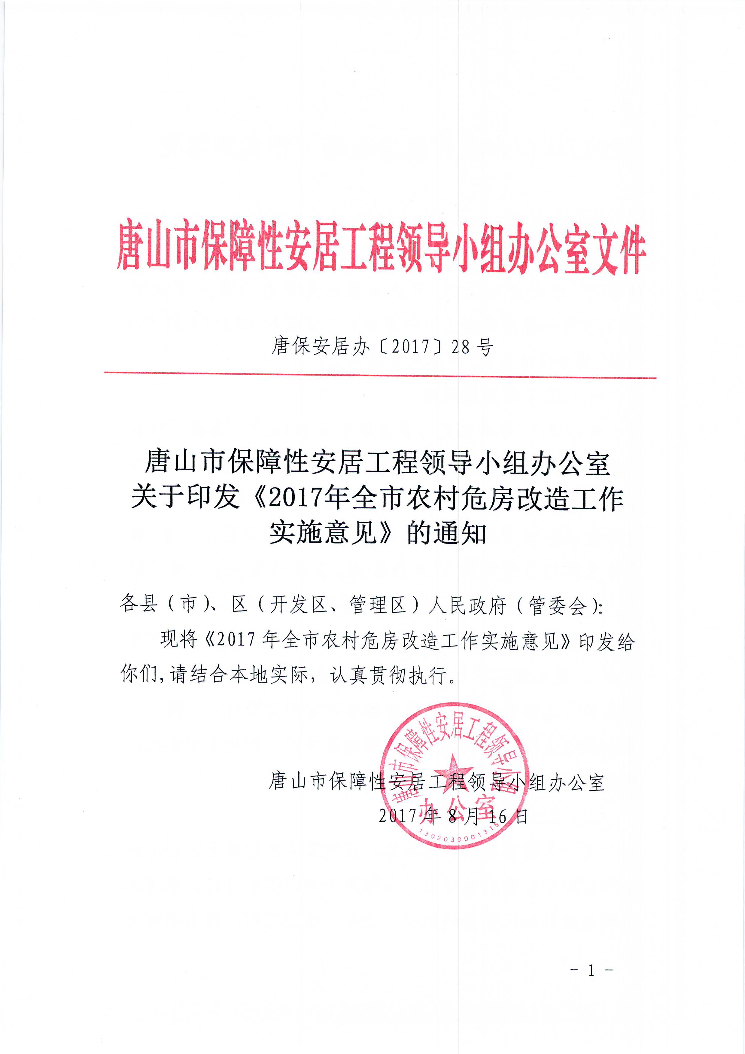 全市2017年农村危房改造任务为2016户。各县(市)、区的改造任务,由省住建厅、财政厅根据全省年度任务及各地脱贫攻坚安排,综合考虑我市各县(市)、区低保户、农村分散供养特困人员和贫困残疾人家庭等四类重点对象(唐山市无建档立卡贫困户)危房存量、工作任务安排、地方财力、建设能力管理等情况确定,现正式下达各县(市)、区农村危房改造任务和具体安排补助资金(见附件1)。各县(市)、区在落实农村危房改造任务时,要与脱贫攻坚工作更加紧密地结合起来,将改造任务落实到贫困村、贫困户。要加强组织领导,认真落实各项政策要求,细化工作举措,确保按时完成年度农村危房改造任务。