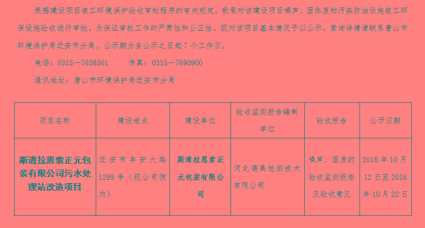斯道拉恩索正元包装有限公司污水处理站改造项目 噪声、固体废物污染防治设施竣工环境保护验收受理情况公开