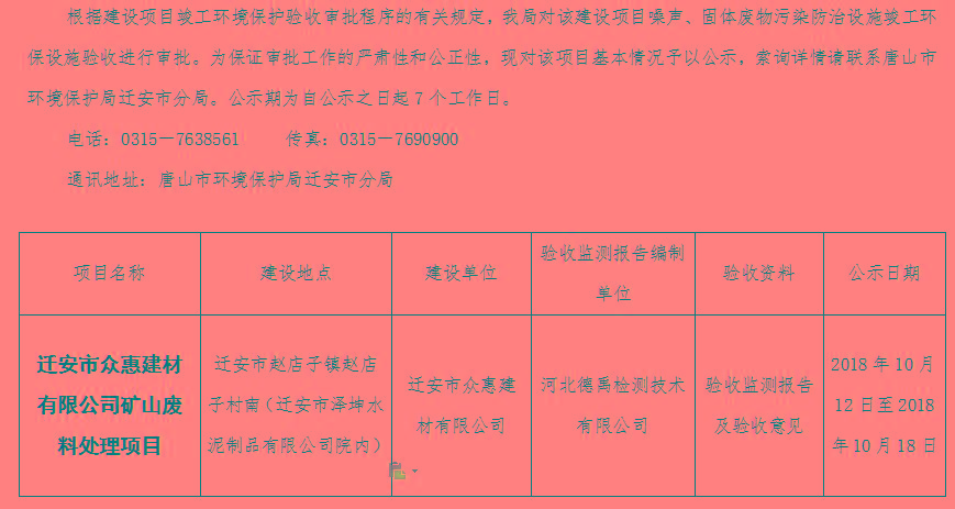 迁安市众惠建材有限公司矿山废料处理项目噪声、固体废物污染防治设施竣工环境保护验收受理情况公开