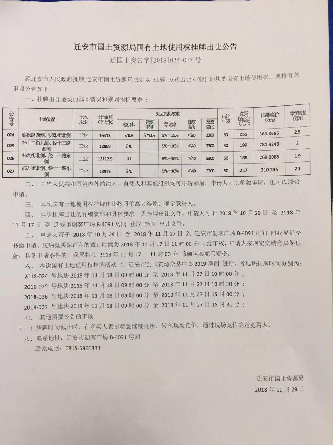 迁安市国土资源局国有土地使用权挂牌出让公告(迁国土资告字【2018】022-027号)