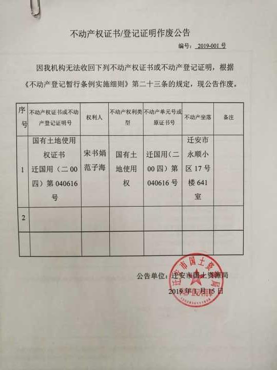 不动产权证书/登记证明作废公告(宋书娟 范子海)