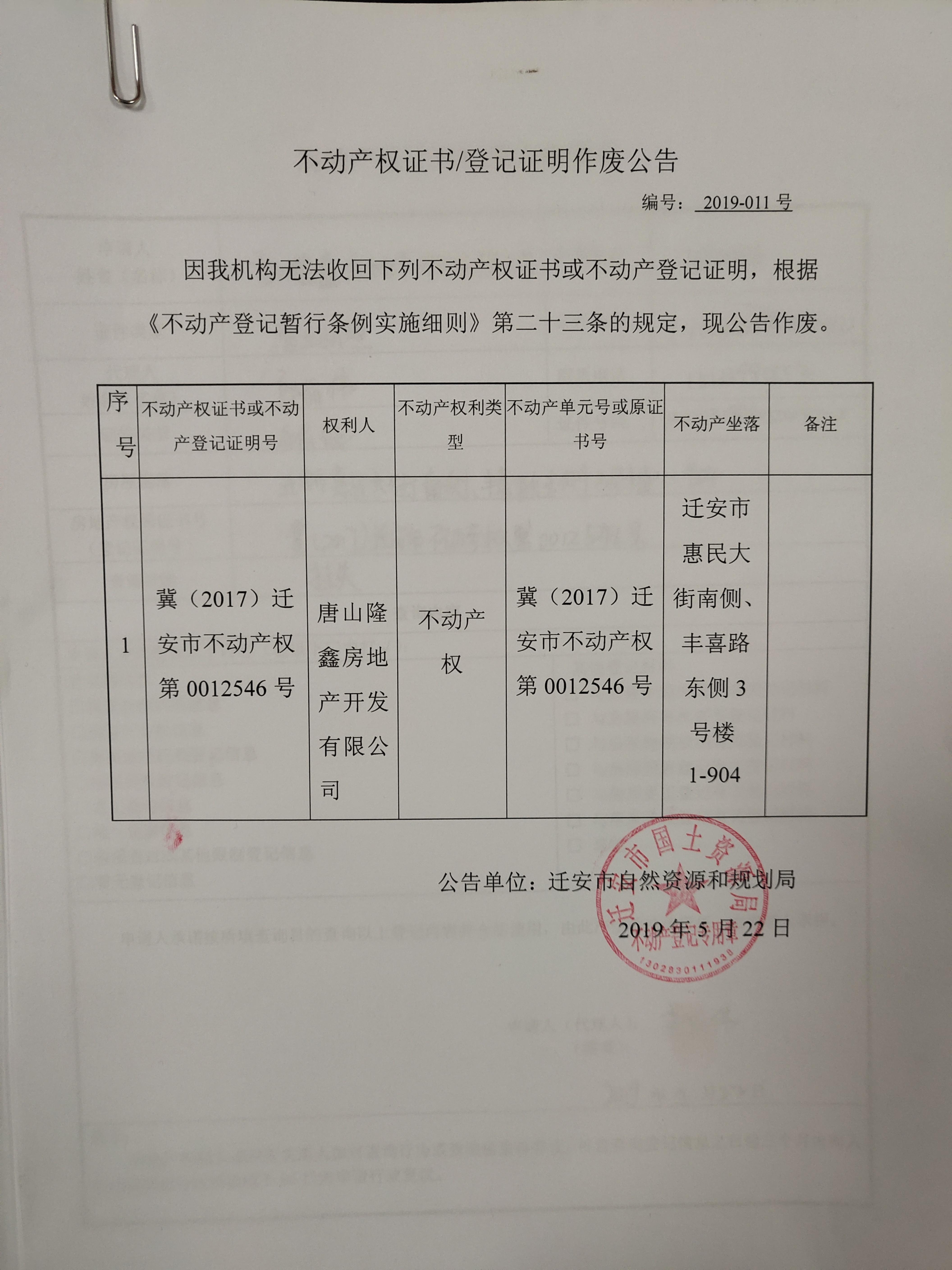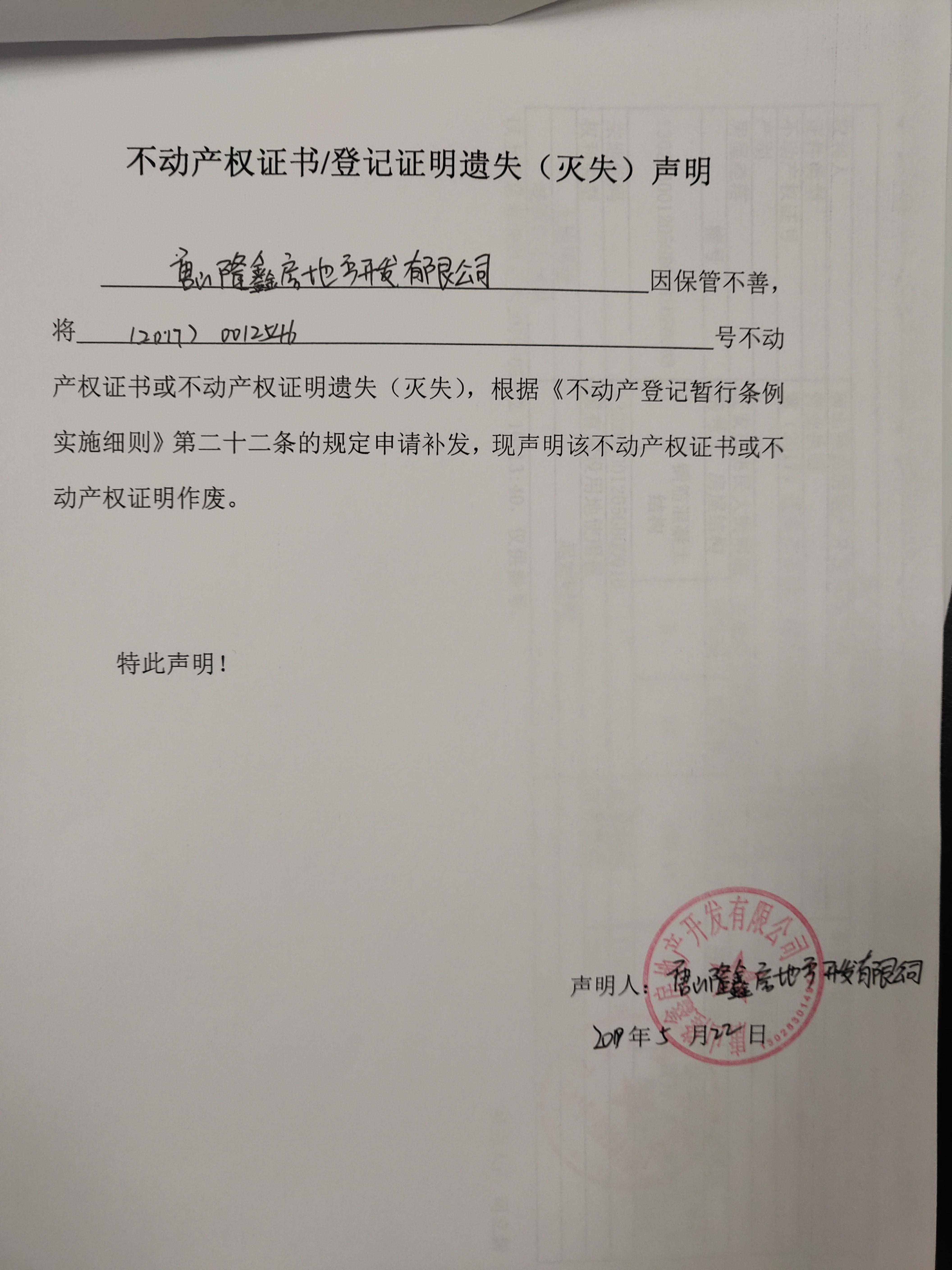 不动产权证书/登记证明作废公告(唐山隆鑫房地产开发有限公司)