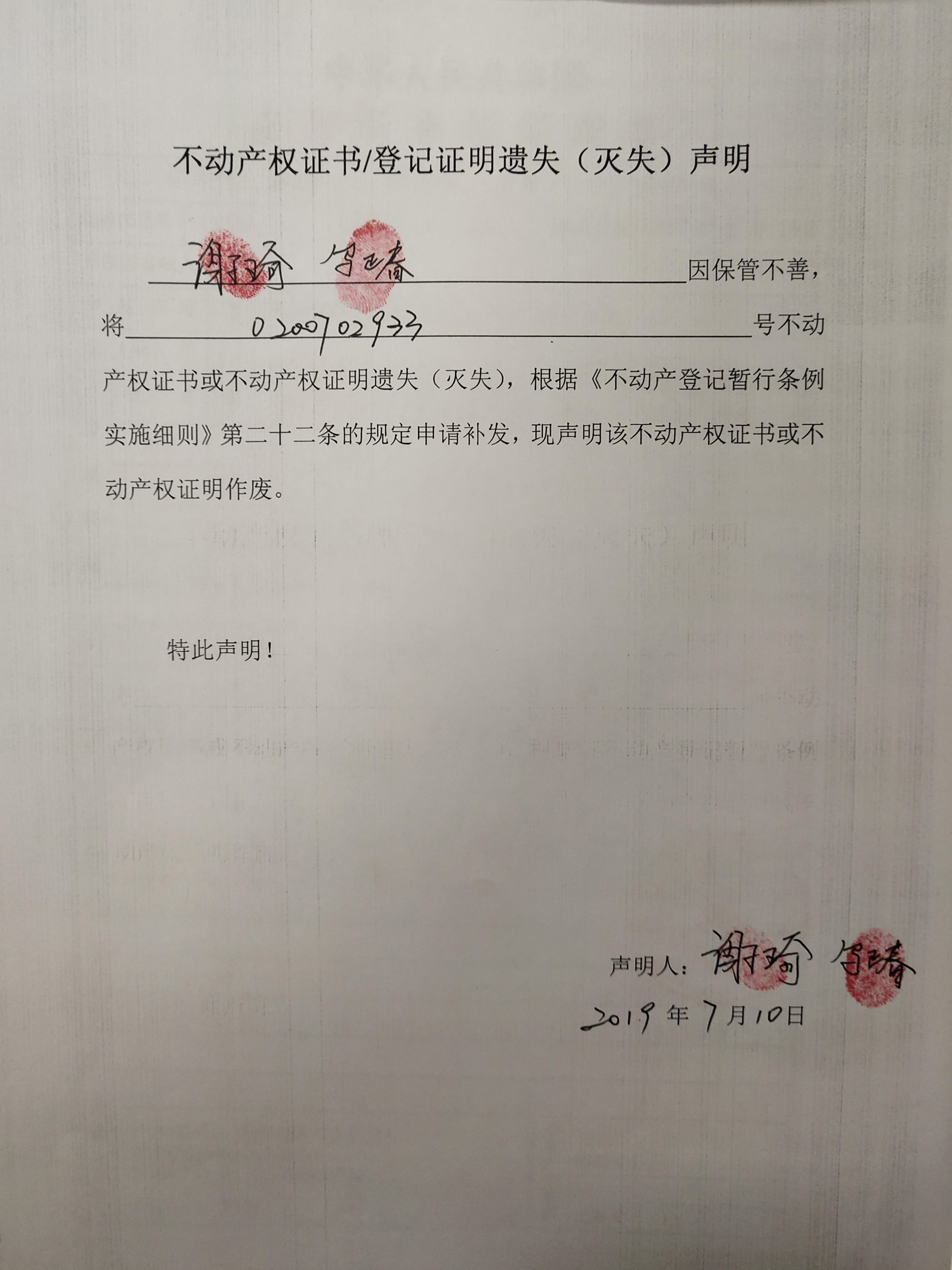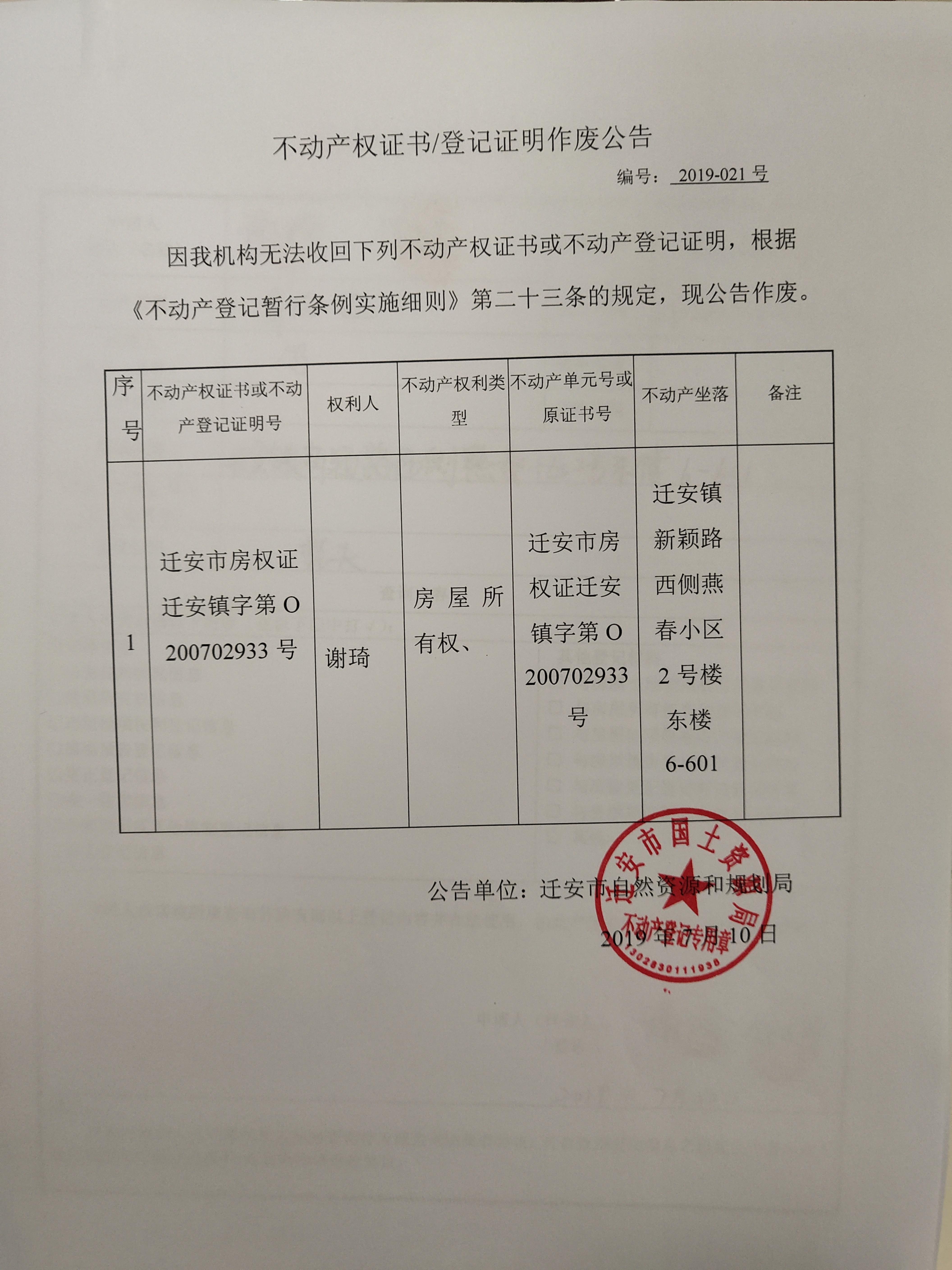 不动产权证书/登记证明作废公告(谢琦)