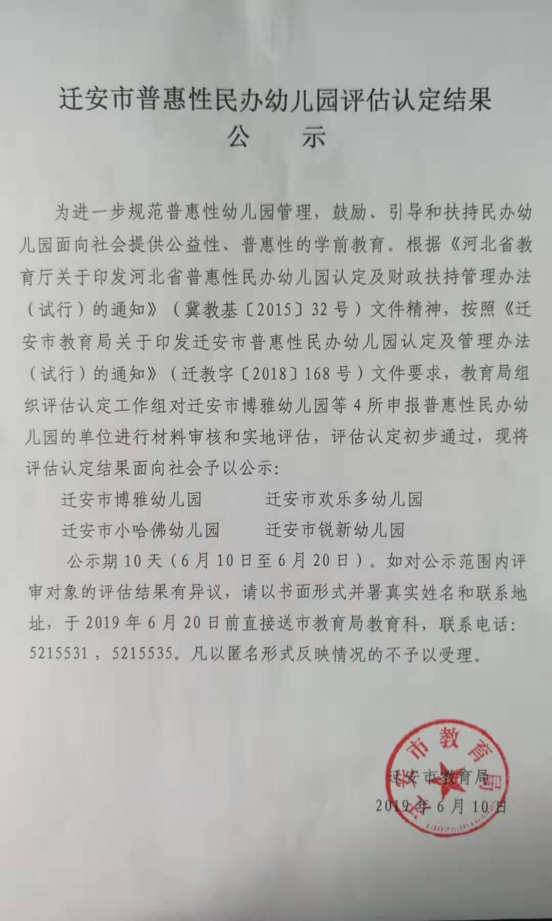 迁安市普惠性民办幼儿园评估认定结果公示(二)