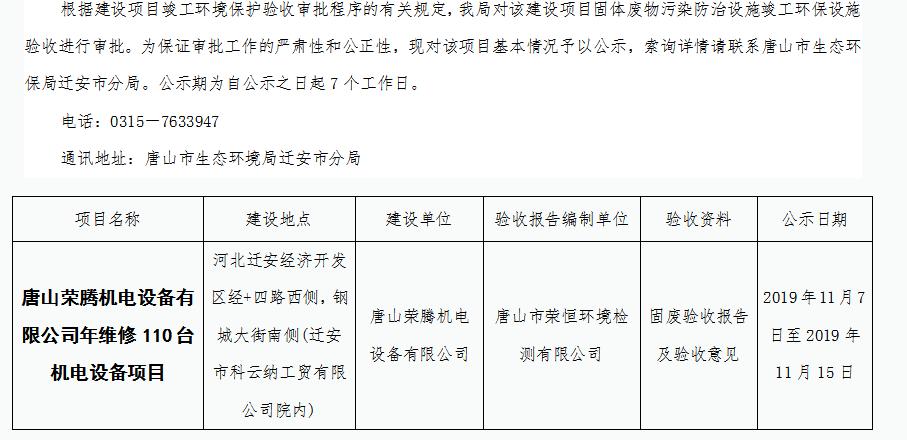 唐山荣腾机电设备有限公司年维修110台机电设备项目固体污染防治设施竣工环境保护验收受理情况公开