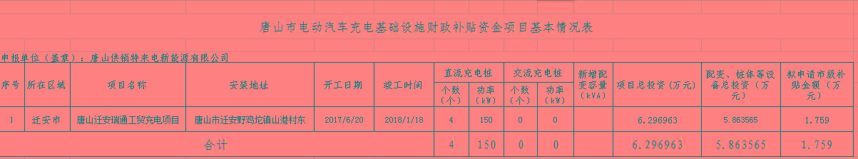 根据《河北省财政厅关于下达2018年省级大气污染防治专项资金用于新能源汽车推广应用补贴的通知》(冀财建【2018】249号)、《唐山市电动汽车充电基础设施建设运营管理办法(暂行)》(唐发改能源【2017】711号)和《唐山市新能源汽车充电基础设施建设项目验收方案》(唐发改能源【2019】144号)相关要求,我局组织有关专家,对区域内2018年的充电基础设施建设唐山迁安瑞通工贸充电项目进行了验收,1个项目通过验收,拟申请补助资金1.759万元。