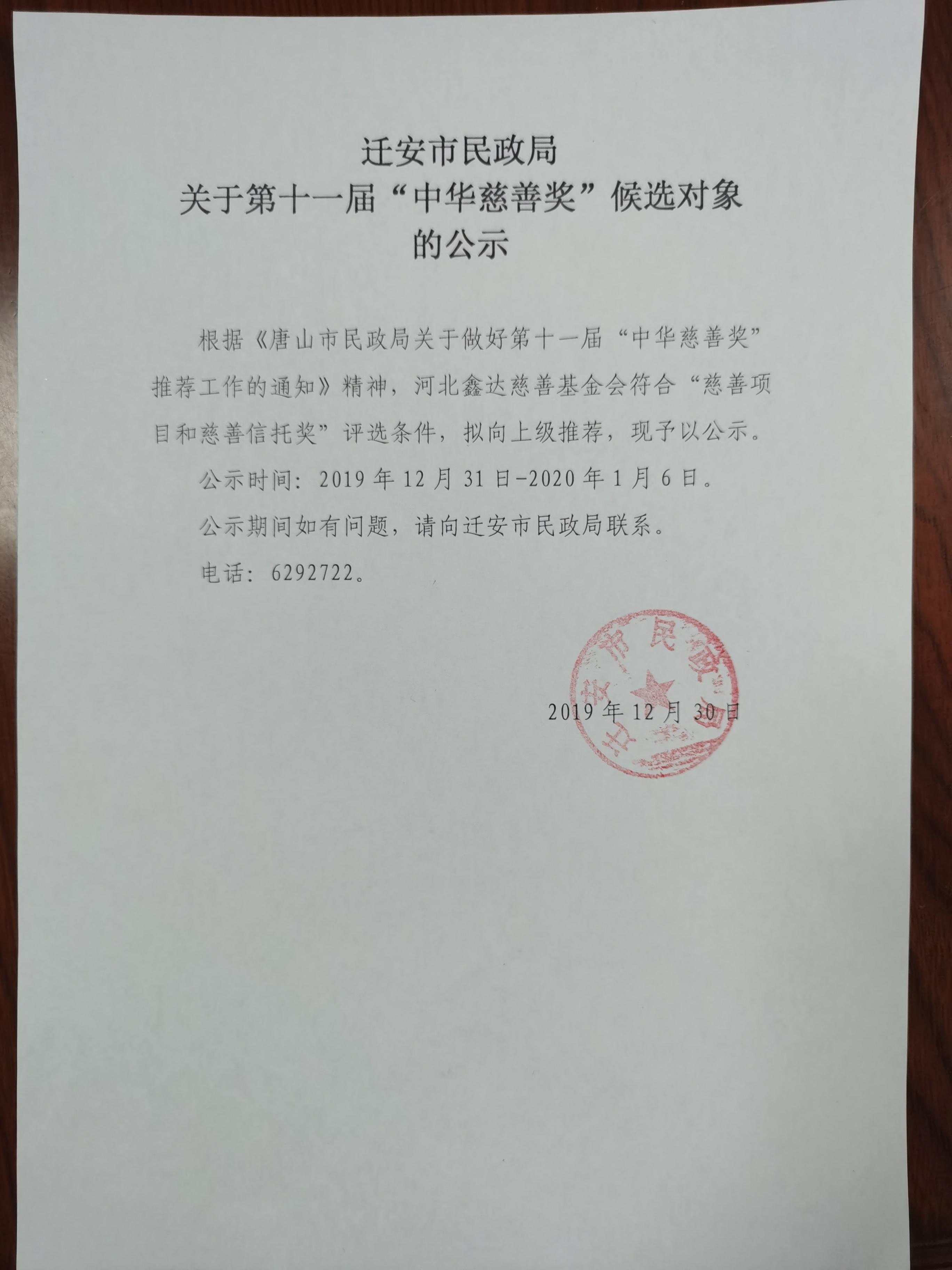 迁安市民政局关于第十一届“中华慈善奖”侯选对象的公示