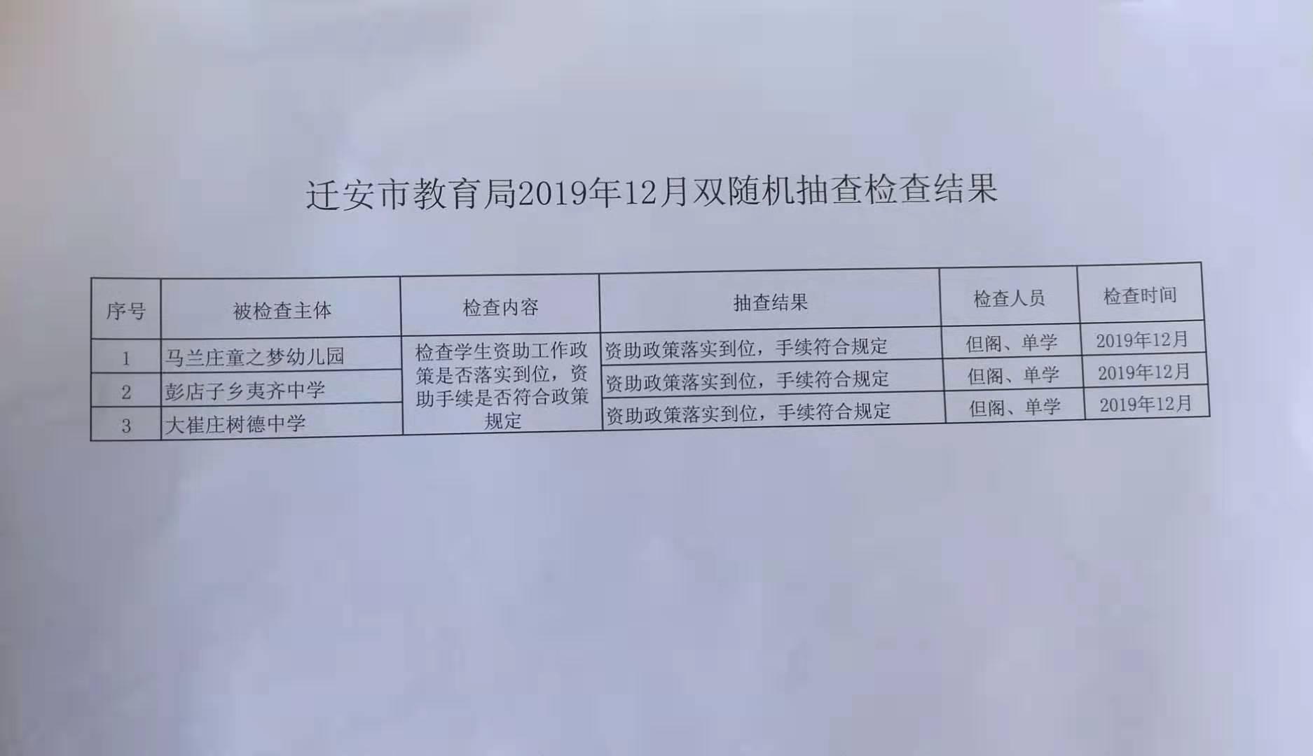 迁安市教育局2019年12月份学生资助工作双随机抽查结果公示
