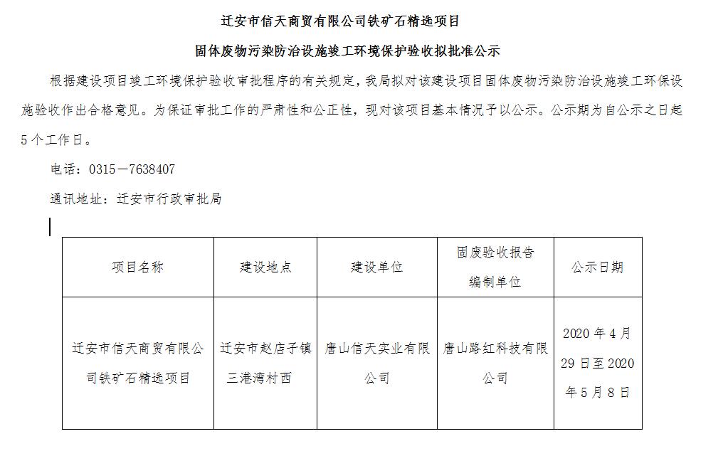 迁安市信天商贸有限公司铁矿石精选项目固体废物污染防治设施竣工环境保护验收拟批准公示