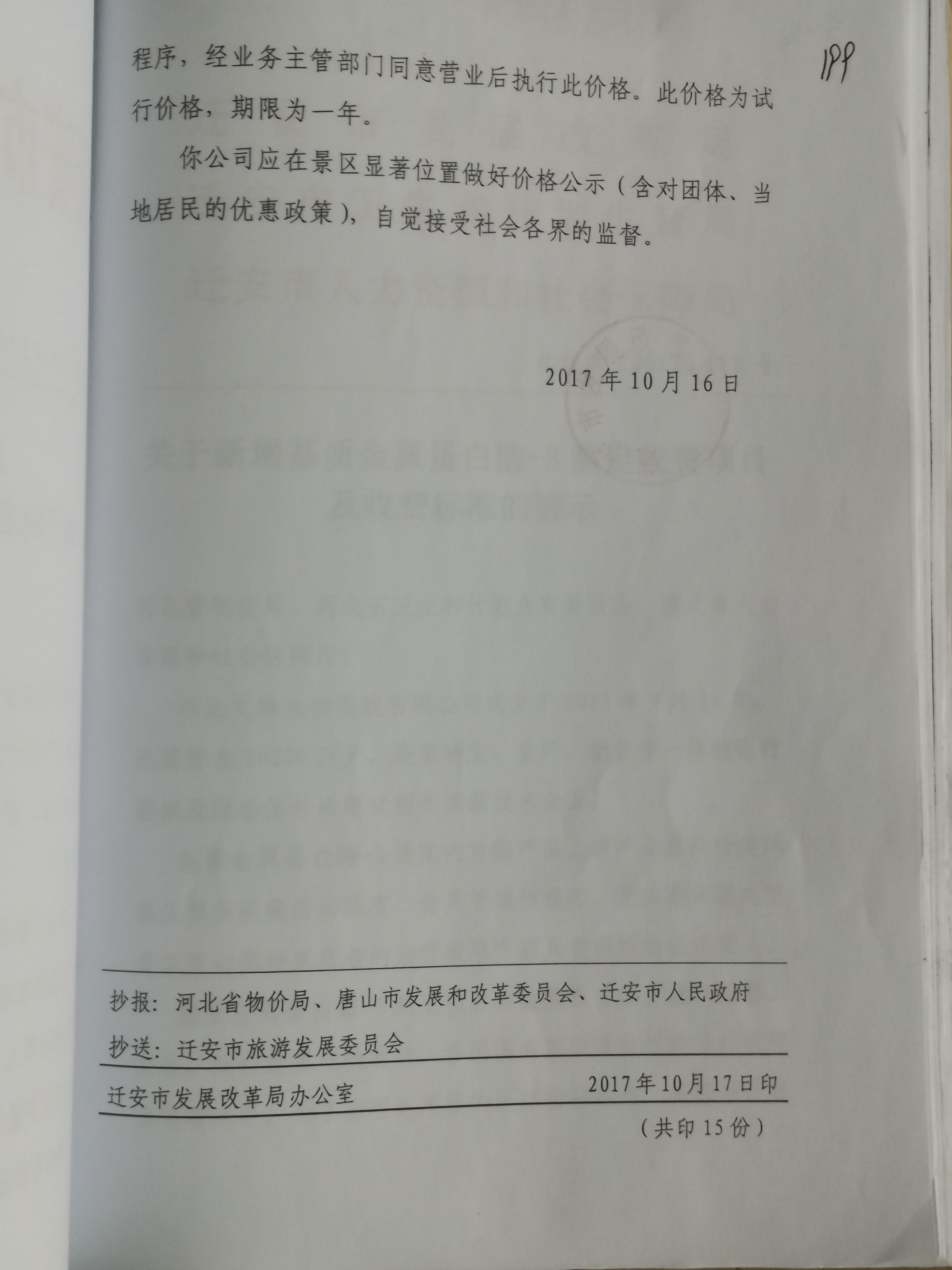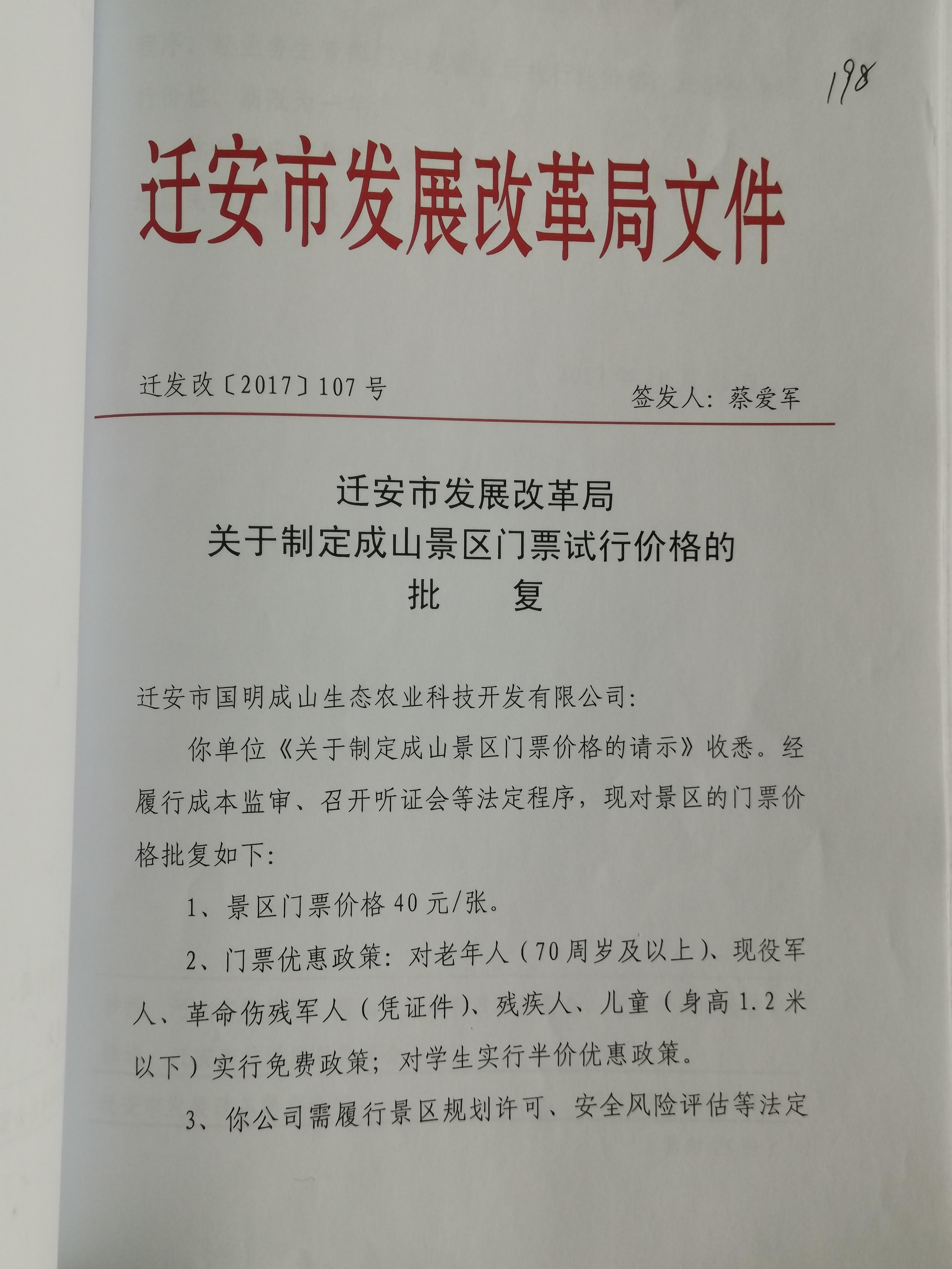 迁安市发展改革局关于制定成山景区门票试行价格的批复