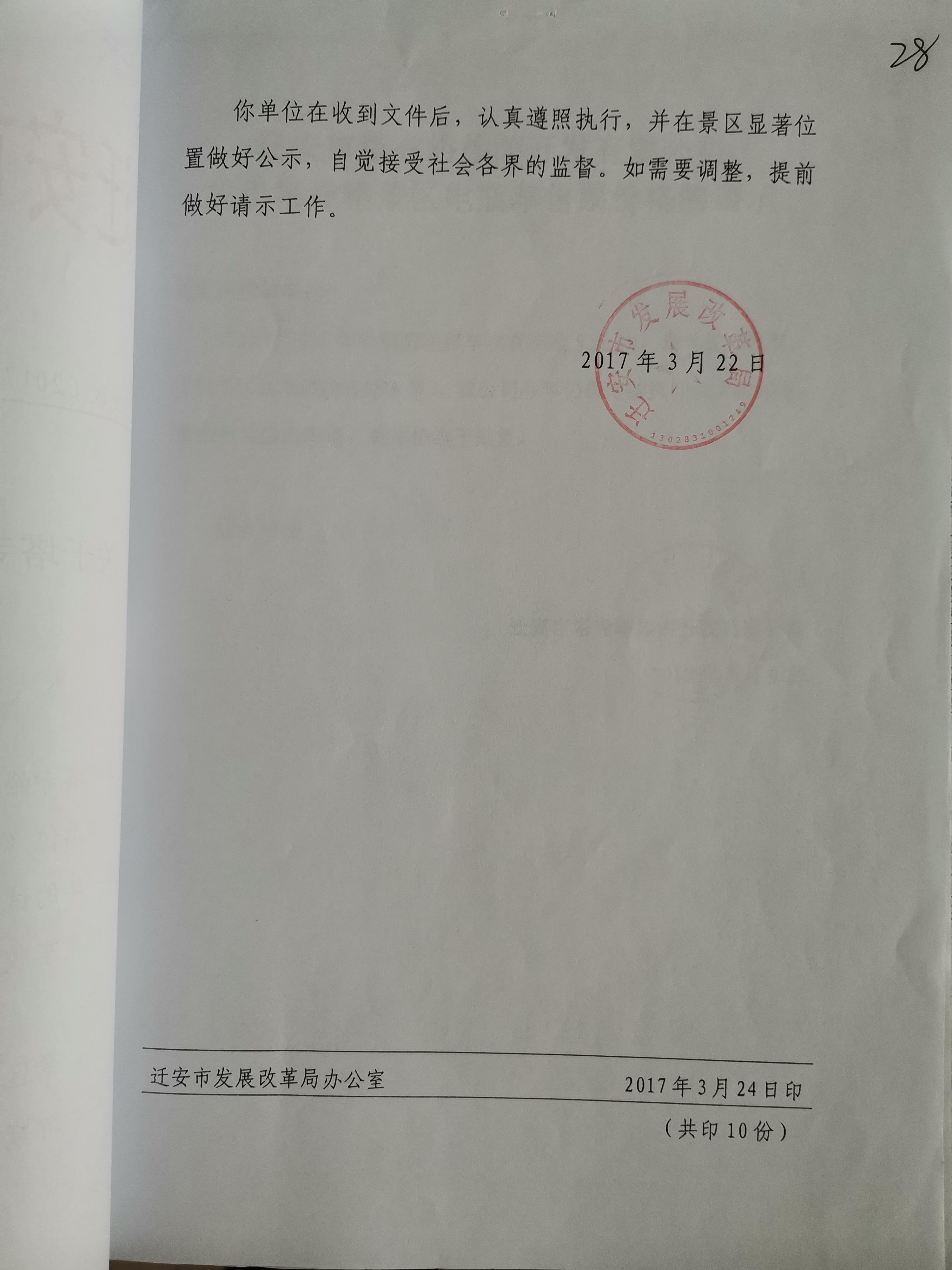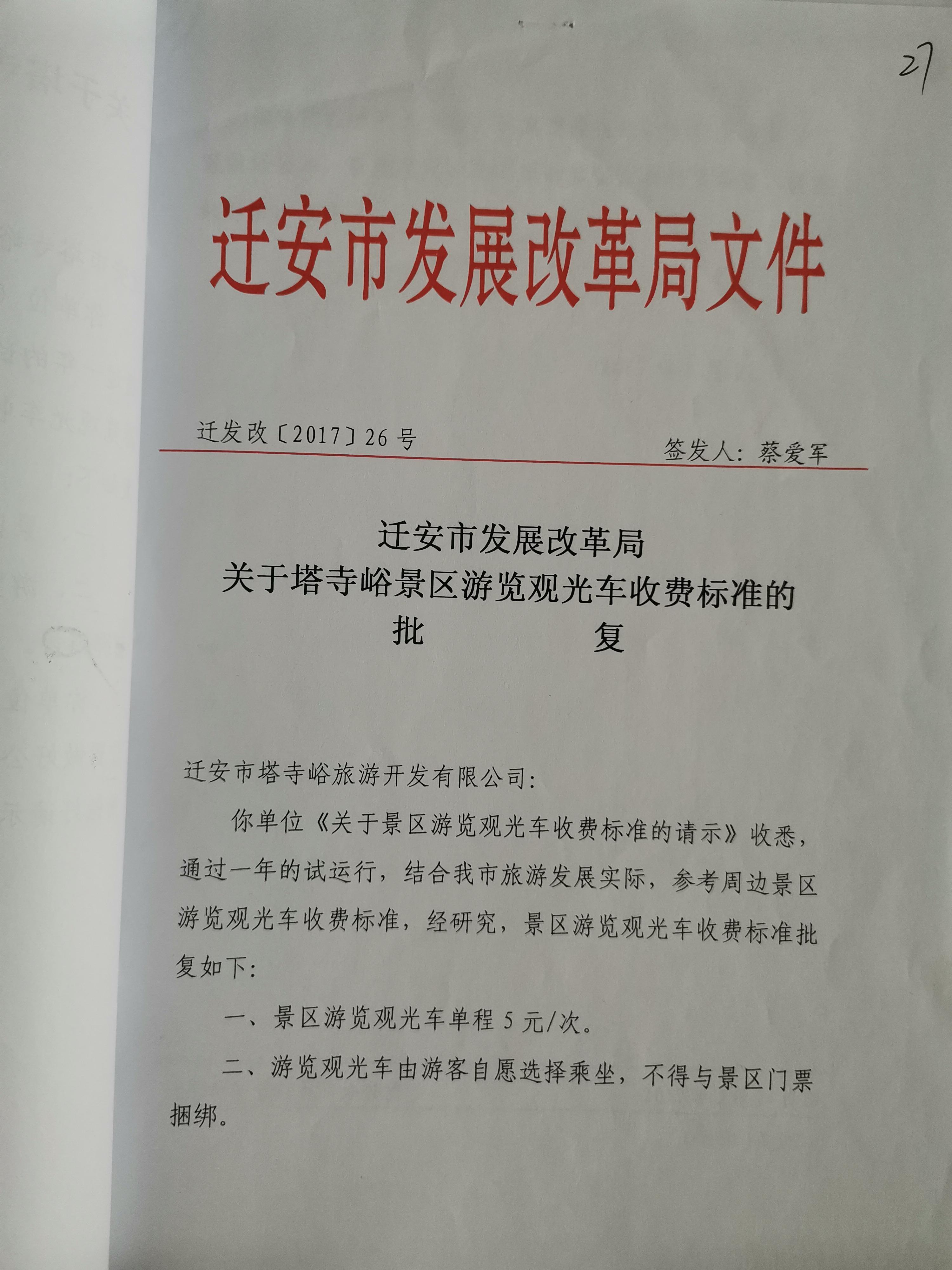 迁安市发展改革局关于塔寺峪景区游览观光车收费标准的批复