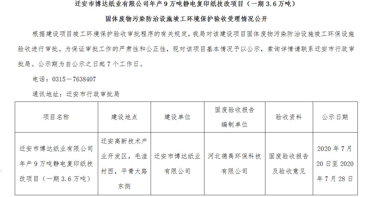 迁安市博达纸业有限公司年产9万吨静电复印纸技改项目(一期3.6万吨)固体废物污染防治设施竣工环境保护验收受理情况公开