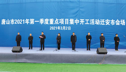 3月2日,唐山市2021年第一季度重点项目集中开工迁安会场在市经济开发区河北百辰铁塔制造有限公司电力铁塔生产项目现场举行,标志着我市吹响了“大抓项目、奋勇争先”的攻坚号角。唐山市人大常委会主任郭彦洪及我市市委书记韩国强,市委副书记、市长王鸿飞,市政协主席李维林,市委常委、秘书长唐延海,市政府副市长孟祥中出席集中开工仪式。开工仪式由韩国强主持。郭彦洪宣布2021年第一季度重点项目开工。