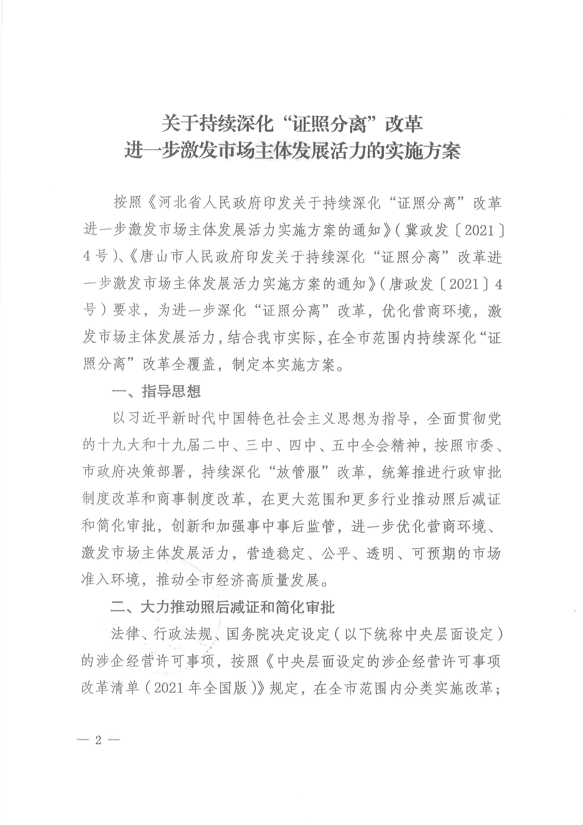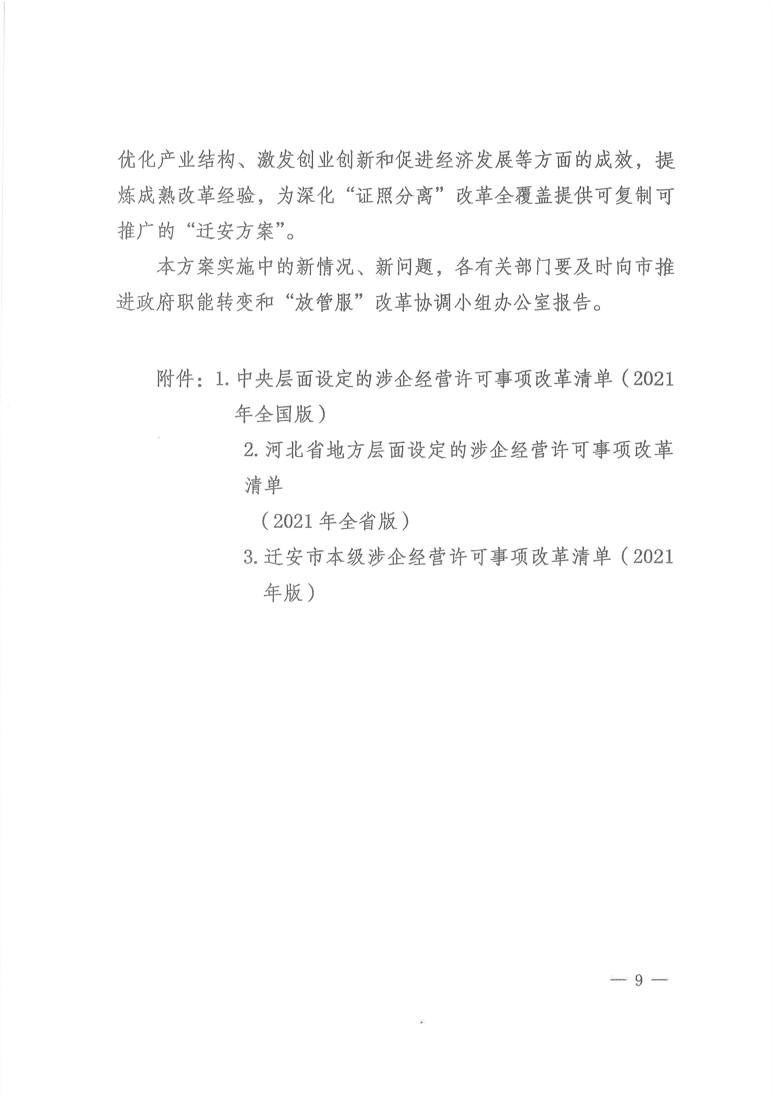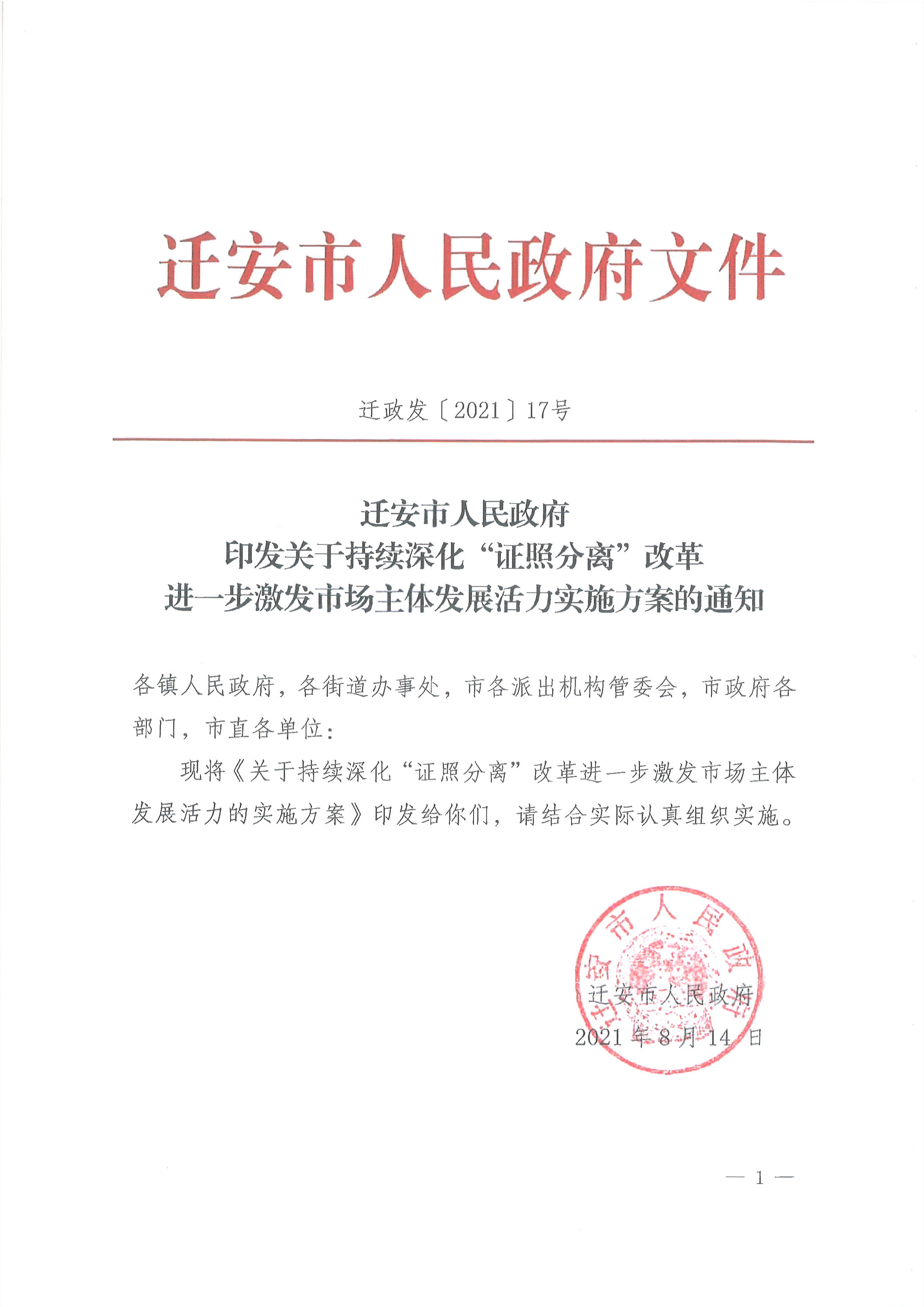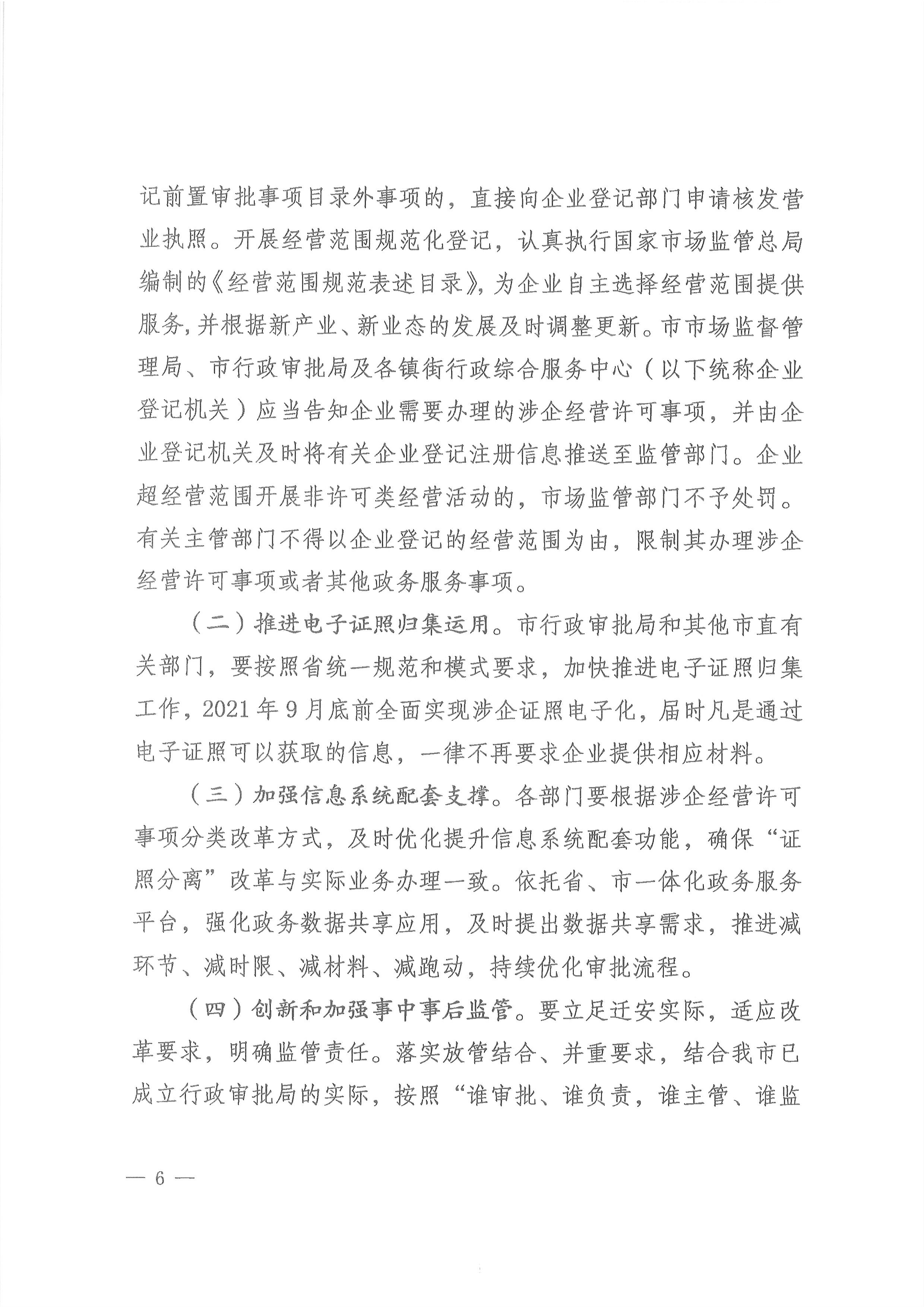 迁安市人民政府印发关于持续深化“证照分离”改革进一步激发市场主体发展活力实施方案的通知(迁政发〔2021〕17号)